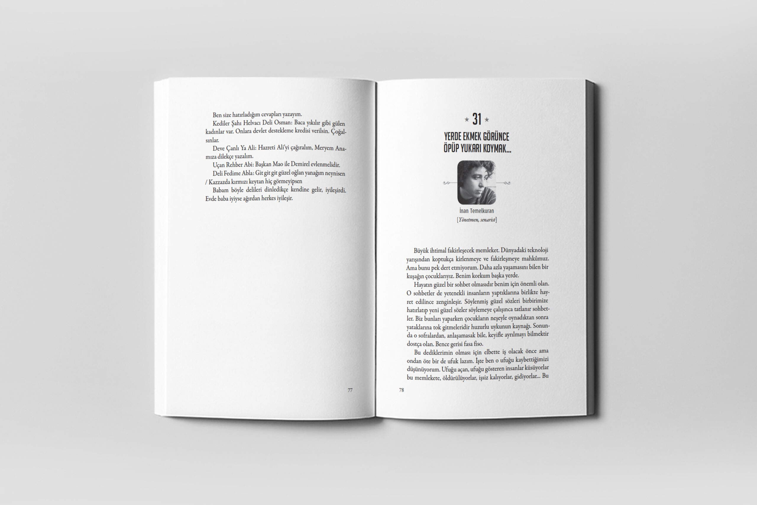 Patronumuz Metin Solmaz’dan ilginç bir kitap. 100 kişiye kahinlik yaptırdı. Üstelik kitap 2016’da çıktığı için şimdi okuması daha da ilginç oluyor: Memleketin hali her daim herkesi tedirgin edebilir. “Şimdi sırası mı?” sorusunu sıklıkla sorabilirsiniz. “Ne olacak bu memleketin hali?” sorusunu okuyup yazan, çizen, fotoğraf çeken, film çeken insanlara sorduk. Sonuçta bebek bakıcılarından astrologlara, ressamlardan mimarlara, avukatlara, akademisyenlere, yazarlara, şairlere, müzisyenlere, film yönetmenlerine enteresan isimlerden oluşan bir derleme oldu. Kitapta Bekir Ağırdır, Oya Baydar, Ömer Madra, Serdar Ateşer, Elif Doğan, Raşit Çavaş gibi pek çok alandan isimlerin yazıları, ünlü mimar Nevzat Sayın, ressam Metin Güçlü, karikatürist Tan Oral, fotoğrafçı Gürcan Öztürk, Çerkes Karadağ ve Alper Fidaner gibi pek çok insanın resim, karikatür ve fotoğrafları var.